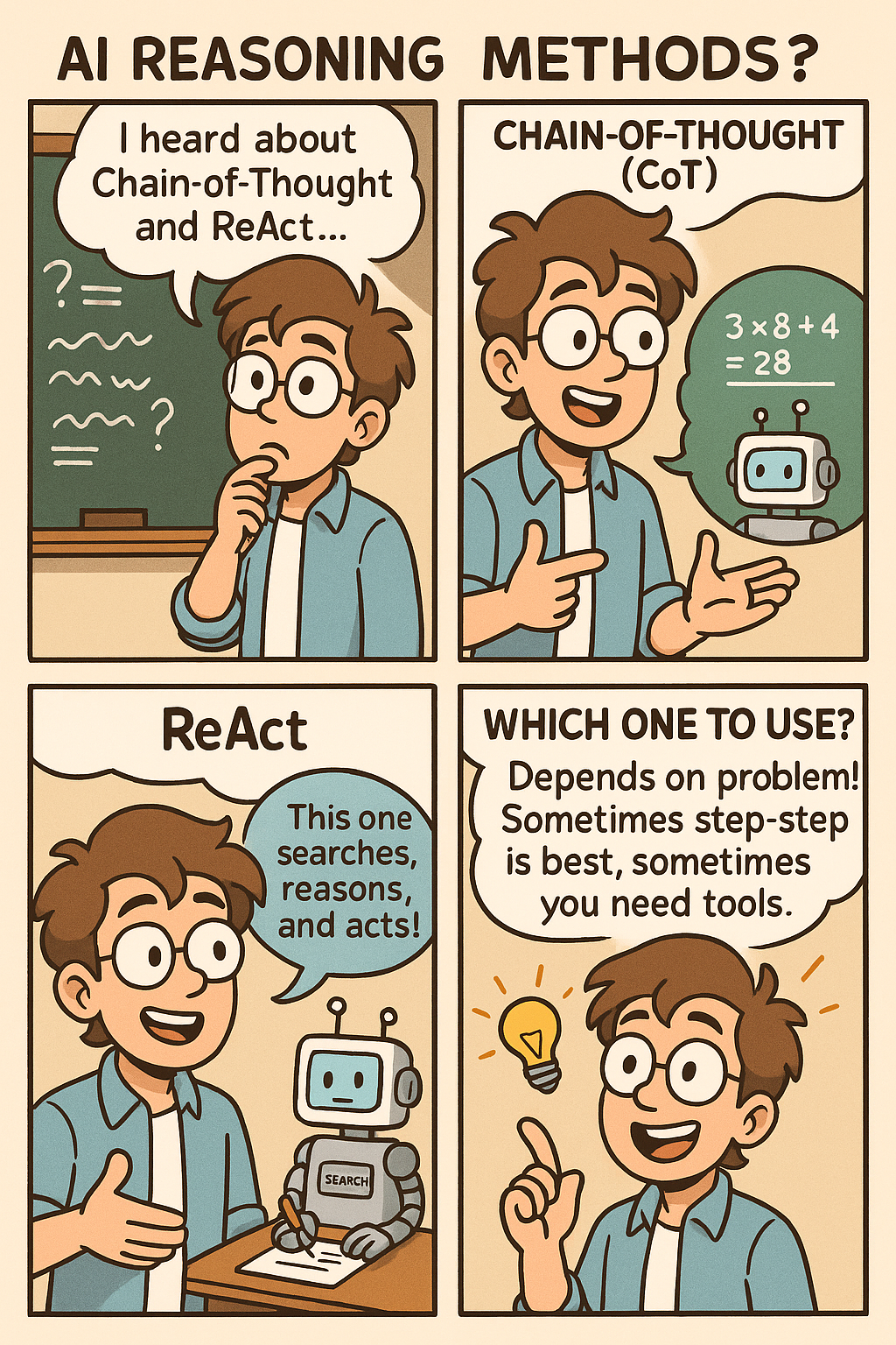 AI 모델이 점점 더 똑똑해지고 있는 요즘, 그 똑똑함의 핵심에는 '추론 능력'이 있어요. 그런데 이 추론이라는 게 생각보다 다양한 방식으로 이뤄진답니다. 그중에서도 요즘 가장 주목받는 방식이 바로 Chain-of-Thought(CoT)와 ReAct예요. 이름만 보면 좀 낯설 수 있지만, 두 방식은 꽤 흥미로운 차이를 가지고 있어요. 오늘은 이 두 가지 추론 방식이 어떻게 다른지, 또 언제 어떤 방식이 더 좋은 선택인지 함께 알아볼게요.