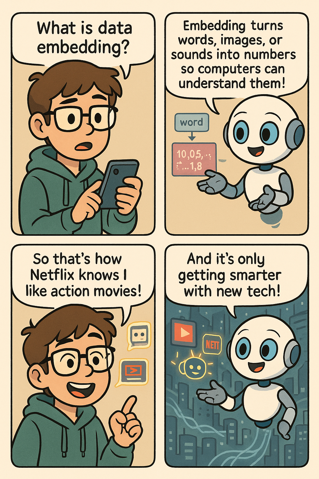 임베딩은 텍스트, 이미지, 오디오 같은 다양한 형태의 데이터를 수치 벡터로 변환하는 기술이에요. 예를 들어, 우리가 말하는 "고양이"라는 단어를 컴퓨터는 글자로 받아들이는 게 아니라, 그 단어가 가진 의미를 숫자로 바꿔서 기억해요. 이렇게 하면 컴퓨터도 단어들 사이의 관계나 비슷한 의미를 이해할 수 있게 돼요.