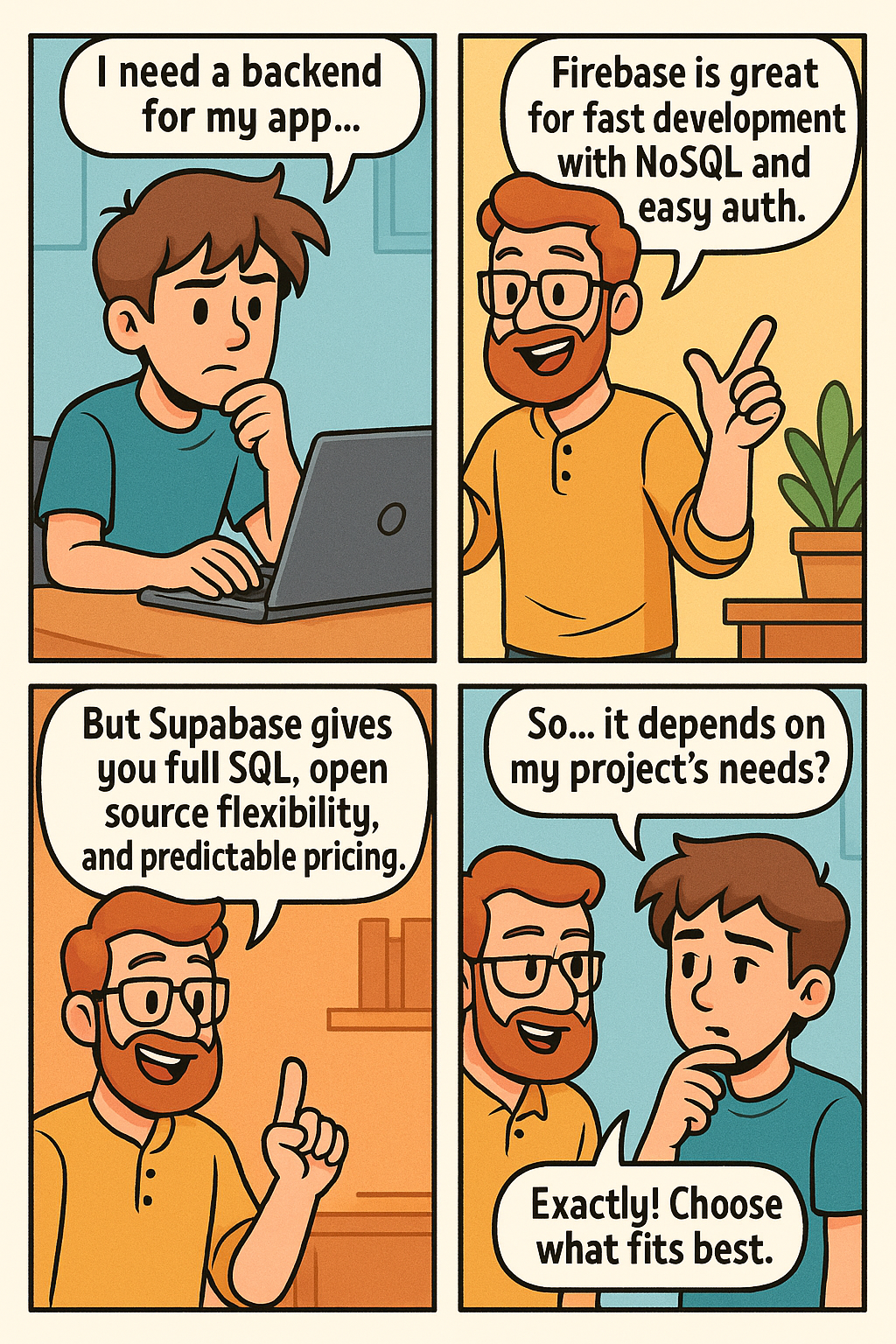 결국 정답은 없어요. 프로젝트의 요구사항, 개발 환경, 예산 등을 고려해서 나에게 가장 적합한 백엔드 서비스를 선택하는 것이 중요해요. Firebase와 Supabase, 각각의 장단점을 잘 따져보고 현명한 선택을 하시길 바랄게요!