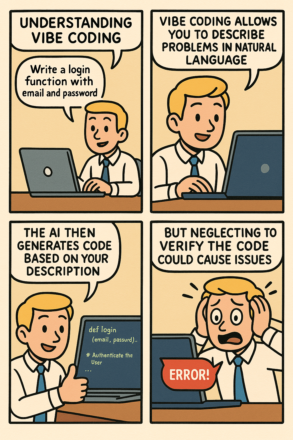 Vibe 코딩은 사용자가 자연어로 문제를 설명하면, AI가 이를 해석해서 필요한 코드를 생성해주는 방식이에요. 예를 들어 "쇼핑몰 회원 가입 폼을 만들어줘"라고 말하면, AI가 알아서 HTML과 자바스크립트로 필요한 코드를 짜주는 거죠. 이렇게 되면 개발자는 코드 하나하나를 다 외우고 쓰기보단, AI가 만든 코드를 보고 수정하거나 응용하는 쪽으로 역할이 바뀌어요. 그만큼 개발자는 더 창의적인 설계나 문제 해결에 집중할 수 있게 되는 거죠.